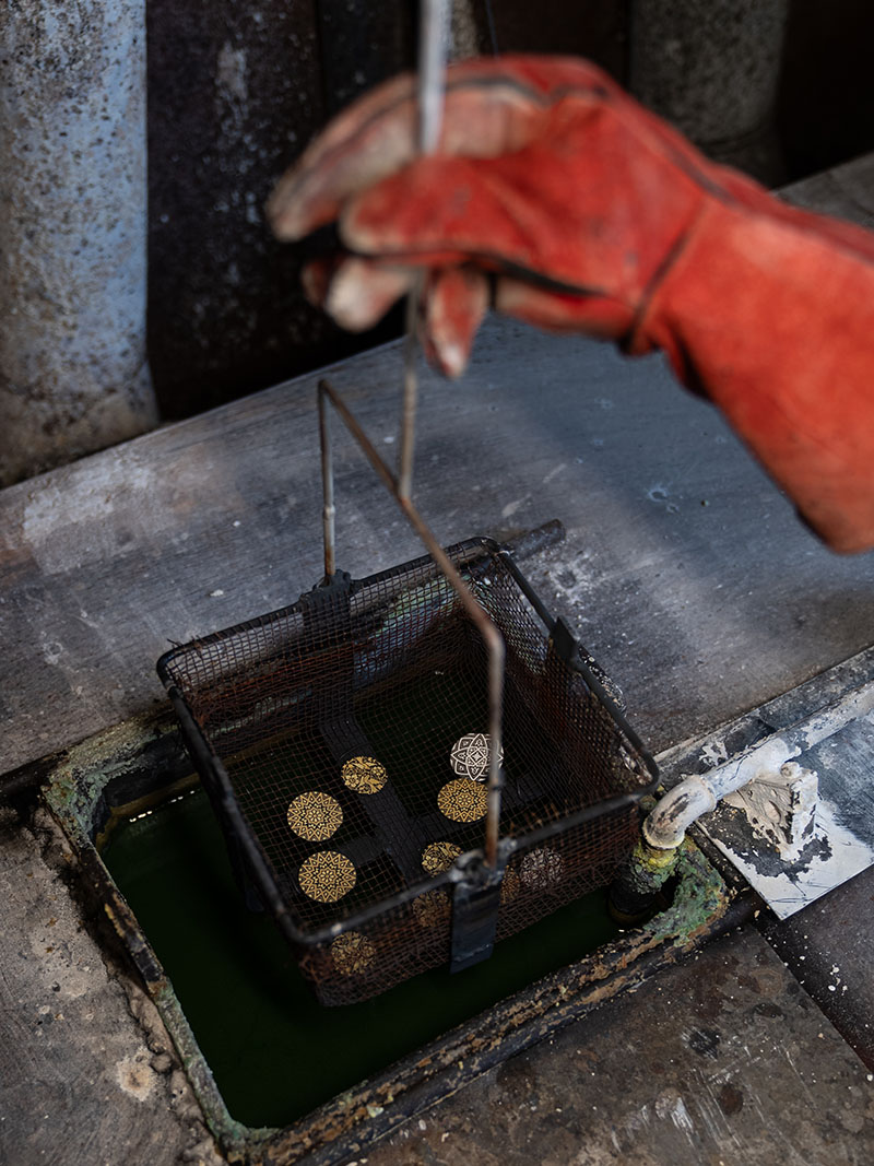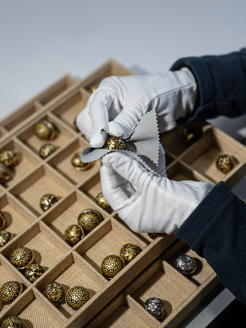 From sketch to bag, each step in the exclusive embossed leather of this limited-edition Pasticcino Bag is a labor of love that requires passion, vision, and expertise. Meanwhile, the iconic spheres come to life through “damascening,” a technique in which gold and silver are skillfully inlaid into engraved steel.
